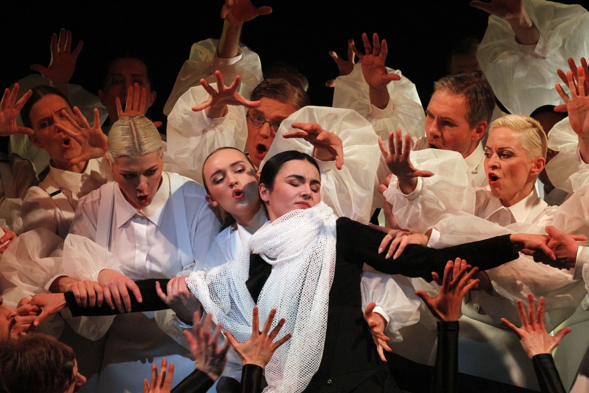 Für die Inszenierung hat sich Hüsers mit Kerstin Steeb eine junge Regisseurin aus Hamburg ans Haus geholt, die überzeugend unter Beweis stellt, wie sich ein rundum gelungener Theaterabend ohne viel Schnickschnack auf die Beine stellen lässt. Voraussetzung dafür ist allerdings, dass wirklich alle mit größtem Engagement an einem Strang ziehen. Wie gut ihr das gelungen ist, zeigt sich vielleicht am ehesten am Chor, dem zahlenmäßig größten Akteur dieser Oper. Denn gesangsolistisch tritt neben dem Protagonistenpaar nur noch Gott Amor als Dritter in Erscheinung. Soll das Bühnengeschehen also in Bewegung bleiben, ist der Chor darstellerisch stark gefordert. Die Regie geht sogar so weit, den Chor immer wieder in die starken Choreographien (Francesco Vecchione) des achtköpfigen Balletts einzubinden, das als Furien und Seelen der Unterwelt das Treiben im Hades bestimmen. Und der Chor macht seine Sache hervorragend.