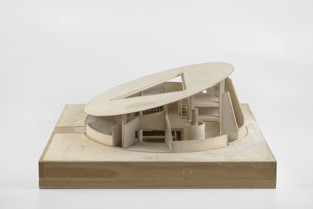 Der Ort, an dem sich mehrere Ausstellungsinstitute und die Museumsinsel Hombroich befinden, ist dafür prädestiniert. Hier steht das letzte Gebäude, das Abraham realisieren konnte: eines von nur zweien in Deutschland. Die Grundsteinlegung des „Hauses für Musiker“ fand 2006 statt, seit 2017 ist es als Veranstaltungsort mit seinen Wohneinheiten für Stipendiaten in Betrieb. Es ist schon aus der Ferne äußerst spektakulär und steht wie ein Palast oder ein Ufo am Rande der Landschaft. Der Rundbau aus Beton ist auf Frontalität und Symmetrie hin angelegt, mit Edelstahlrampen und Wendeltreppen im Wohntrakt und einem Innenhof für Konzerte. Abgeschlossen wird er mit einer Betondecke, die neigend und sich dabei verdünnend auf Stahlbetonsäulen aufliegt und zu schweben scheint. Zudem ist in sie ein riesiges Dreieck geschnitten, so dass sie sich zum Himmel öffnet, worin sich Abrahams Interesse für Astronomie und Astrologie widerspiegelt. Wenige Schritte davor, im Siza-Gebäude, findet nun die konzentrierte und dabei umfassende Ausstellung statt. Sie bezieht weitere Bauten und Konzepte ein und veranschaulicht beispielsweise, wie konsequent Abraham in den Boden, in die Horizontale oder in die Höhe gebaut hat. Dass in der Nachbarschaft die Langen Foundation die Sammlung Ringier und die Skulpturenhalle Werke von Reiner Ruthenbeck zeigen, macht den Besuch auf der Raketenstation erst recht attraktiv.