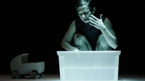 Eine Frau schiebt einen winzig kleinen Kinderwagen. Da sie aber auf mindestens zehn Zentimeter hohen Absätzen trippelt, muss sie sich ganz tief hinunter beugen und gleichzeitig ihren Po in die Höhe recken. Fürsorgliche Mutter sein und sich zum erotischen Objekt stilisieren, zwei Funktionen, die sich im humorvoll-pointierten Bild treffen, das Marion Dieterle in ihrer Choreographie „Fleisch und Puppen“ entwirft.