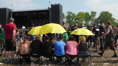 Petrus hat ein Herz für Punks. Am zweiten Tag des Ruhrpottrodeos lächelt die Sonne bei sommerlichen Temperaturen auf tausende Besucher herab. Beim Rodeo verhält es sich anders als bei Punk im Pott, wo sich eine komplette Subkultur durch den Oberhausener Bahnhof zwängen muss, um ins gelobte Land zu kommen. Auf dem platten Feld in Hünxe, gerahmt von sattgrünen Wiesen und beschaulich wippenden Baumkronen, über die vereinzelt ein Segelflugzeug lautlos dahinschwebt, sind Zeltplatz und Festivalgelände pittoresk gelegen.