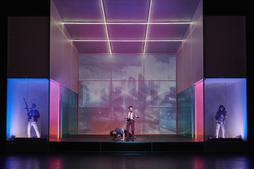 Esther Hattenbach inszeniert das alles merklich reduziert. Die großen mächtigen Bilder im Hintergrund (Kathrin Dworatzek) beherrschen den Raum komplett, da hilft auch keine riesige farbwechselnde pseudomoderne Kunststoffarchitektur mit zwei Rein-und-Raus-Türen ganz ohne Requisiten. Aber die acht Schauspieler kommen dennoch recht gut dagegen an. Ihre Choreografie, oft mehr so in Zeitlupe, bleibt auf den Brettern dagegen recht statisch. Als Gesamtkunstwerk ist der Abend aber sehenswert, die Szenenfolge bleibt klar, die Inhalte transparent wie die smarten Räume, in denen sie verhandelt werden, und die Drohnen-Plage wird uns noch eine Weile ungeregelt heimsuchen. Denn die KI-Ingenieure lassen sich ja wohl lieber erst mal „krankschreiben“.