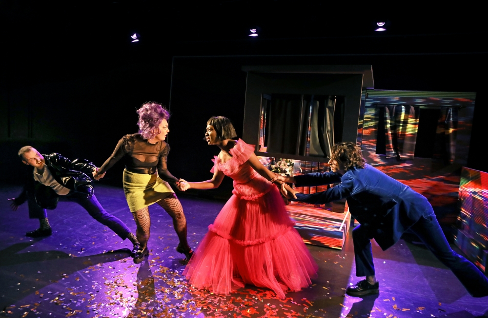 Im kleinen Studio Dortmund beginnt der Himmel oder sagen wir besser ein Ort, den sich Bürokraten der Welt immer so als Paradies vorgestellt haben. Ordnung muss schließlich wohl auch dort sein. Wo kämen wir sonst hin ohne passendes Formular? In die Hölle? Die winzige Bühne reicht Regisseurin Azeret Koua aus, um Jean-Paul Sartres Spiel mit der zweiten Chance zu inszenieren. Die beiden Protagonisten in seinem Drehbuch „Das Spiel ist aus“ von 1943 sind ermordet worden und landen an der Kasse einer kleinen nicht gerade existenzialistischen Autoscooterhalle. Der Revolutionär Pierre (Adi Hrustemovic) und Eve (Sarah Yawa Quarshie), die Gattin seines Widersachers, müssen erst den Tod akzeptieren um sich dann trotz ihrer diametralen Lebenssituationen – ist ja auf dem Rummel auch niemand anderes da – näher zu kommen. Um sie herum wirbeln noch zwei Geister (Antje Prust und Raphael Westermeier), die kommentieren, analysieren und boshaft manche Qual auskosten, schließlich sind Eve und Pierre nach erzwungenen Unterschriften unter diverse Dokumente richtig tot. Blöd. Aber! Erst mal kriegen sie von den paffenden, aufgekratzten Geistern in kleinen witzigen Szenen vorgespielt, warum und weshalb sie beide aus niederen Beweggründen ermordet wurden.