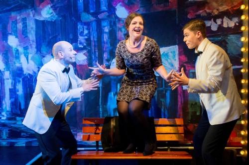 Man ertappt sich allerdings bei dem Gedanken, warum Budde das Freundespaar Don (Florian Siegmund) und Cosmo (Karim Oubad) nicht umgekehrt besetzt hat. Rein äußerlich würde man Oubad den strahlenden Leinwandhelden Don eher abnehmen, während Siegmunds Physiognomie mehr dem „Clown“ Cosmo entgegenkommt. Aber vielleicht waren es ja die kleinen schauspielerischen Unsicherheiten Oubads, die für den schon in „Crazy for You“ souverän aufspielenden Siegmund den Ausschlag gaben. Auch Annika Tahiri (Kathy) wirkt optisch etwas deplatziert neben dem einen Kopf kleineren Siegmund, zumal sie Kostümbildnerin Susanne Schwarz in ein unvorteilhaftes, trutschiges „Hausfrauenkleid“ gesteckt hat, wo doch ein glitterhaftes Show-Outfit angesagt gewesen wäre. Zum Glück kann Tahiri das mit ihrer erfrischenden Schauspielerei überdecken und steht auch, wie ihre KollegInnen Hannah Dickl, Celine Tess, Leonie Hackländer und Leon Gleser (in verschiedenen Nebenrollen) ihre Frau in den hübschen Choreografien von Nadja Görts, die natürlich die legendären Regenschirme zum Einsatz bringt.