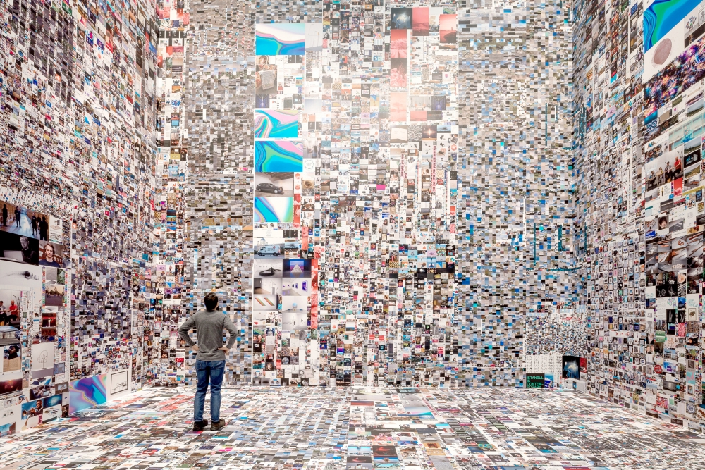Evan Roth, Since you were born, 2019–ongoing, Digitaldruck auf Wandtapete. Ortsspezifische Installation, hier eine Version des MOCA Jacksonville, 16. März – 23. Juni 2019 © Evan Roth, Foto: Doug Eng, Courtesy MOCA JacksonvilleDer Parcours startet mit dem markanten Plakatmotiv zur Ausstellung: ein scheinbar monströser giftgrüner Apfel mit Bissspuren im Vordergrund, der nicht allzu weit vom zarten Stamme gefallen ist. Der Abstand zwischen Baum und Frucht kann jedoch nicht wahr sein … Wie Kathrin Sonntag 2022 ihre Fotoreihe „Dinge im Hintergrund“ produzierte? Ist lösbar, bei genauem Hinschauen. Direkt nebenan erzählt Duane Michals 1973 eine komprimierte Fotostory in Schwarz-Weiß, die von Bild zu Bild neue Überraschungen bereithält: „Things are queer“ (1973), in der Tat, ein neckisches Verwirrspiel. Solche Aha-Effekte hat die Ausstellung noch häufiger zu bieten. Verblüffend ist allein schon, welch inspirierende Vielfalt dem Thema „Größe in der Fotografie“ abgewonnen werden konnte, wie viele verschiedene Facetten und jeweilige Wirkungen, Nutzungen und Funktionen flott und spielerisch angerissen werden, ohne durch Didaktik zu nerven oder durch Überfülle zu erschlagen. Nach dem Ausstellungsbesuch wird man garantiert die Fotowelt mit anderen Augen sehen. Vielleicht sogar darauf brennen, auf Fotopirsch zu gehen und mit etwas Glück Teil der Ausstellung zu werden: mit einem eigenen pfiffigen Motiv rund um verschobene Größenverhältnisse auf dem Monitor im letzten Raum.