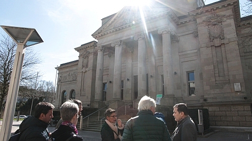 Doch nicht nur auf der Fahrt erfuhren die Neuzugewanderten Spannendes, von Oberbarmen ging es zurück zur Werther Brücke, von wo aus man dann zu Fuß den Weg zum Haus der Jugend, zum Barmer Rathaus und zur Germarker Kirche lief. Wer weiß noch, dass das Haus der Jugend früher Ruhmeshalle hieß und der Bau dem Berliner Reichstag nachempfunden wurde? Und vor der NS-Zeit eine renommierter Ausstellungsort für expressionistische Kunst war? Oder wer hat schon den Astropfad in der Barmer Fußgängerzone entdeckt, der zum Beispiel die Venus am Werth 73 verortet?