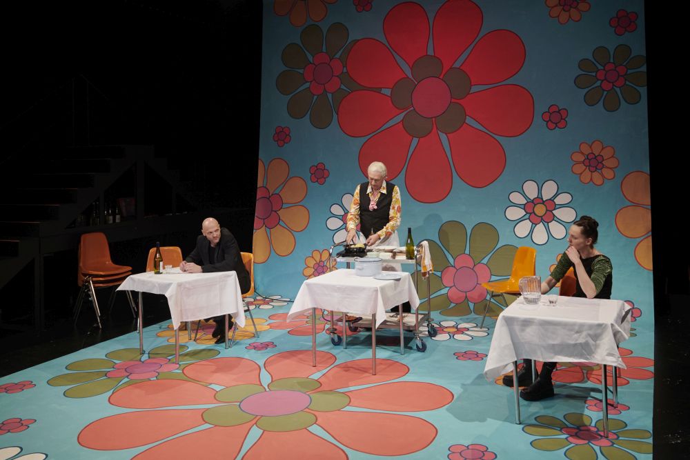 Jetzt haben die lieben Liebenden den Weg ins Theater am Engelsgarten gefunden und Insider fragen sich natürlich schon vor der Premiere, wer wohl sterben muss. Doch Regisseur Stefan Maurer inszeniert Goethes Urfassung mit den bigamistischen Untertönen, die zu verschiedenen idealistischen, aber auch schaurigen Resultaten führen kann. Die kleine Wuppertaler Bühne ist ein einziges Zitat auf die bunte Flower-Power-Pril-Welt der 1970er, als es schick war, in Küchen mit bunten Blumenaufklebern Objekte farbig zu ersticken. Eine lange Tapete, ein paar orangefarbene Campingstühle, ein Tisch und zwei schwarze Treppen rechts und links reichen, um die Spielorte des Schauspiels für Liebende (also nicht Trauerspiel in fünf Akten) anfangs zu generieren, zum Finale hin öffnet sich dann der Raum. Die drei Liebenden prallen aufeinander, Fernando hin- und hergerissen zwischen den Damen Stella und Cäcilie, und dann ist da ja auch noch Lucie, seine Tochter. Er will also Stella wieder verlassen und zurück zu Frau und Kind, Verzweiflung macht sich breit, mittendrin der Wirt des Gasthofs, der kluge Zitate und Empfehlungen serviert.