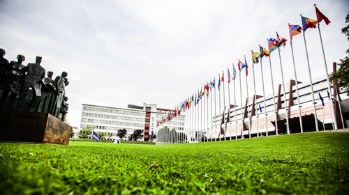 Etwas weiter stoßen wir auf die Agora, die seit 2008 die drei Generaldirektionen des Europarates beherbergt. Nötig wurde sie, als nach dem Fall der Berliner Mauer die Anzahl der Mitgliedsländer des Europarates von 23 auf 47 stieg. Hier befindet sich auch der Europäische Gerichtshof für Menschenrechte, der über die Einhaltung der Europäischen Menschenrechtskonvention wacht.