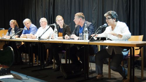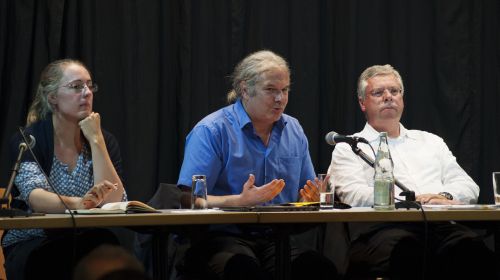 Um die Vorgeschichte dann auch abzuschließen: Vielleicht gibt es ja Themen, die Einseitigkeit erlauben. Auch heute sprachen außer Hardt nur Kritiker von TTIP und CETA (dem Pendant-Plan mit Kanada): TeilnehmerInnen waren die Bundestagsabgeordneten Katharina Dröge (Grüne) und Andrej Hunko (Linke), das Kölner Stadtratsmitglied Susana dos Santos Herrmann (SPD) sowie Guido Grüning, DGB-Vorsitzender der Region Wuppertal/Bergisch Land. Damit nicht genug: Auch in den gut gefüllten Zuschauerreihen hätte sich wohl kaum ein Freund besagter „Handelserleichterungen“ finden lassen, und nicht erst im Fragenteil bekam der tapfere Einzelkämpfer Hardt das auch zu hören.