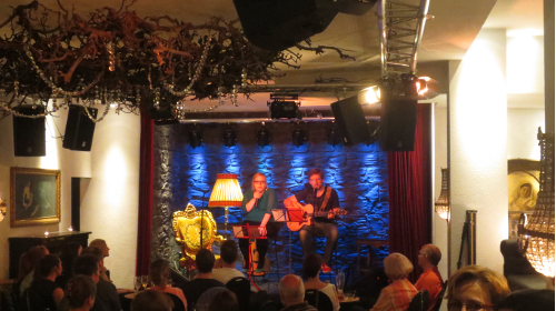 Antikes Holzmobiliar, üppige Lampenschirme und goldgerahmte Gemälde – dieses barock anmutende Ambiente bietet Kleinkünstlern regelmäßig eine Bühne für Musik, Kabarett oder Poetry Slams. Diese Bühne, ausgekleidet mit Naturstein und umrahmt von schweren, roten Vorhängen, befindet sich mitten im Raum, umgeben von alten Ledersofas und massiven Holztischen. Eine Kulisse wie aus einem Theaterstück.