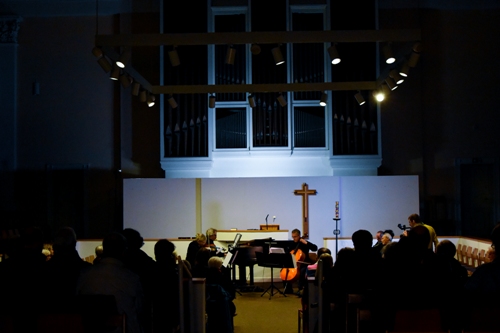 In der Sophienkirche kam das Werk in Auszügen intensiv zur Vorstellung. Es sprach Bernd Kuschmann, seit Jahrzehnten großer Künstler des Wuppertaler Schauspiels. Hinzu trat ein eigens zum Text komponiertes musikalisches Werk: „Armenische Totenlieder“ von Volker Felgenhauer. Mit seinen fünf Sätzen wurde diese Uraufführung komplett gespielt vom Trio Cascades: Thomas Palm (Klavier), Katrina Schulz (Geige), Alexander Mrowka (Cello) intonierten vorab zudem Musik von Komitas Vardapet, der als Begründer der modernen klassischen Musik Armeniens gilt. „Kranich, bringst du mir Nachricht aus meiner Heimat?“, hieß es darin übersetzt; „ein Lied, das Armeniern sehr nahe geht“, bekannte Arlin Cakal-Rasch zu Beginn, die heute die Moderation übernommen hatte.