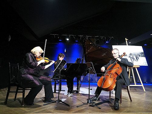 Dazu passend sind die fünf Abschnitte des Werks „Armenische Totenlieder“ des 1965 geborenen Komponisten Volker Felgenhauer eingebettet, nach Gedichten von Armin T. Wegner, in einer Überarbeitung vom Trio Cascades. Die Sätze dieses Opus 17 lauten: Epitaph – Blutgericht („Die kurdischen Hirten …“) – Gesang des zum Galgen Verurteilten („Die Schlinge hatten sie Hamparzum bereits um den Hals gelegt …“) – Todesreigen armenischer Mädchen („In die Luft springend …“) – Epitaph. Diese detaillierte Kammermusik mit klagenden Melodien intonieren Katrina Schulz (Violine), Alexander Mrowka (Violoncello) und Wolfgang Peternell (Klavier) intensiv mit großen musikalischen Spannungsbögen. Eingerahmt ist die Veranstaltung mit Musik aus der Feder des armenischen Priesters und Musikers Komitas Vardapet (1869-1935). Zu Beginn spielt das Trio den Angang des Stücks „Andouni“ (Heimatlos), zum Schluss „Krunk“ (Der Kranich). Beide gehören mit zu seinen bekanntesten Liedern, die in einer instrumentalen Fassung zu Gehör kommen.