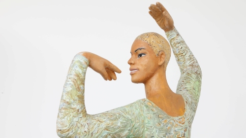 Die flachen weißen Podeste fassen die Skulpturen zu Gruppen zusammen und nehmen ihre fließende Bewegtheit auf. Im Skulpturenpark Waldfrieden reagieren Luise Kimmes Figuren in ihren Bewegungen aufeinander, überhaupt erfüllt ein wogender Tanz den Pavillon. Die Frauen besitzen farbenfrohe Kleider, die Männer tragen Anzüge im unterschiedlichsten Zuschnitt, allesamt wirken sie elegant, herausgeputzt auf eine angenehme Weise, auch wenn sie Strandkleidung tragen. Die Körper selbst ragen schlank empor, die Beine und Arme sind über das natürliche Maß hinaus gelängt. Der Wechsel von weichen und kantigen Verläufen gibt den Takt dieser Figuren vor, die eine pure Lebensfreude vermitteln. Dabei handelt es sich immer um Schwarze. Die Gesichter sind genau geschnitten und im Ausdruck fröhlich und bisweilen entrückt. All das wird durch den Realismus des Kolorits unterstrichen, sofern nicht das rohe Holz belassen ist. Auch dann berührt uns die Genauigkeit und Intensität der Figurendarstellung.